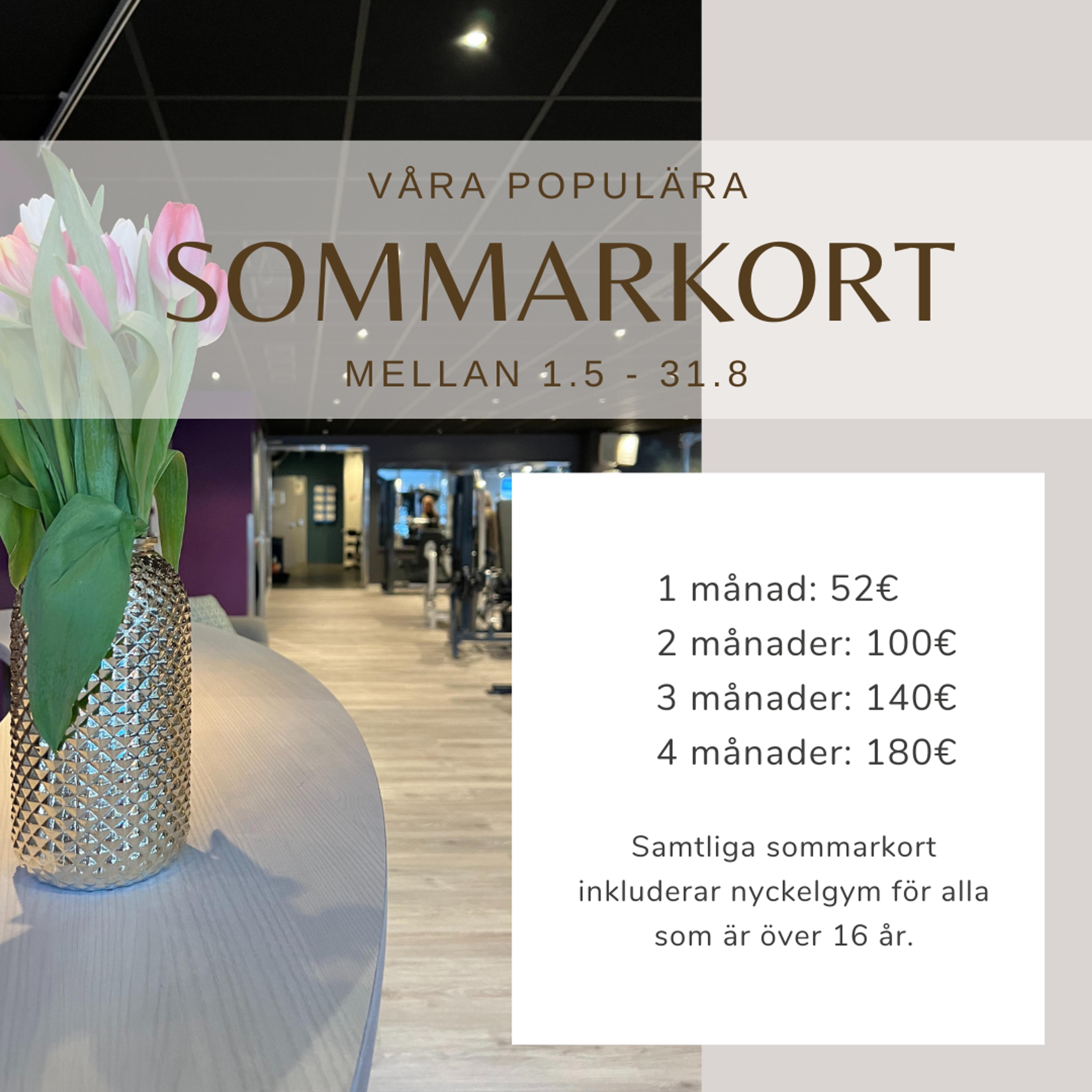 🌞 Gäller mellan 01.05.2025 till 31.08.2025 – inga bindningstider eller uppsägningstider! Från och med 1.5 kan du skaffa ditt sommarkort hos oss i receptionen eller via vår hemsida.